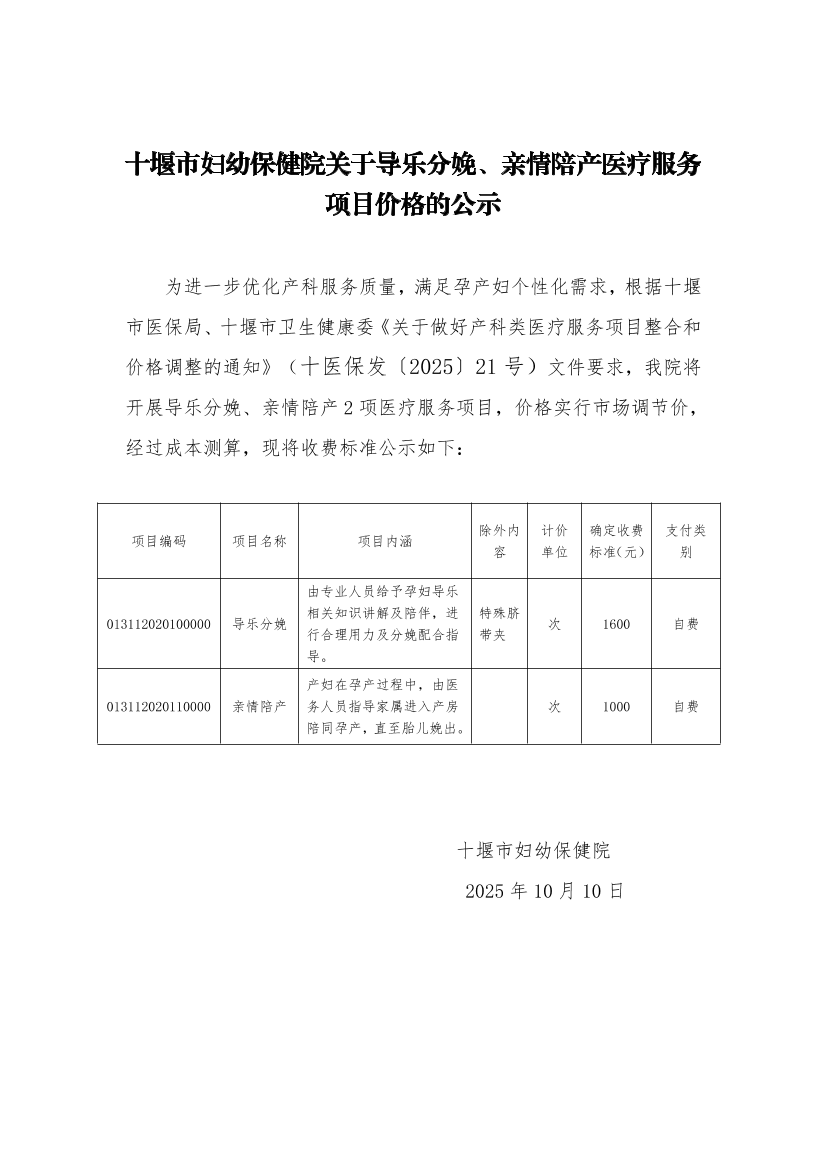 十堰市妇幼保健院关于导乐分娩、亲情陪产医疗服务项目价格的公示