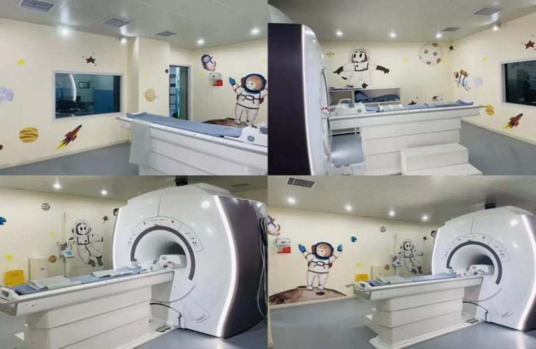 十堰市妇幼保健院放射影像中心引进美国进口GE最新型SIGNA 355 1.5T超导磁共振,该设备在磁共振成像过程中充分结合AI人工智能技术,大大提高扫描检查和图像后处理的速度,并且还具有儿童静音专属扫描序列,让小朋友在熟睡中就能完成检查。并且科室围绕妇幼保健院特色、以人文关怀为主,将传统检查项目与温馨、舒适且富有童趣的检查环境相结合,给冰冷的检查设备附上梦幻的主题。