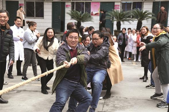 随着市妇幼保健院院歌的响起,“庆三八”趣味运动会活动正式拉开帷幕。院领导代表医院向全院的女性职工致以节日的问候。15时30分,运动会正式开始,参赛选手奋勇争先,拉拉队在旁加油助威。第一个比赛项目是拔河,两支参赛队伍先比3次,选出获胜方,随后获胜队伍再进行比拼,最终选出冠军队伍。“加油!加油!”在拔河比赛开始时,拉拉队员们在一旁高声为科室同事呐喊,现场的参赛队员们双手紧紧握住绳子,全身用力向后倒,涨红的脸上写满了斗志。