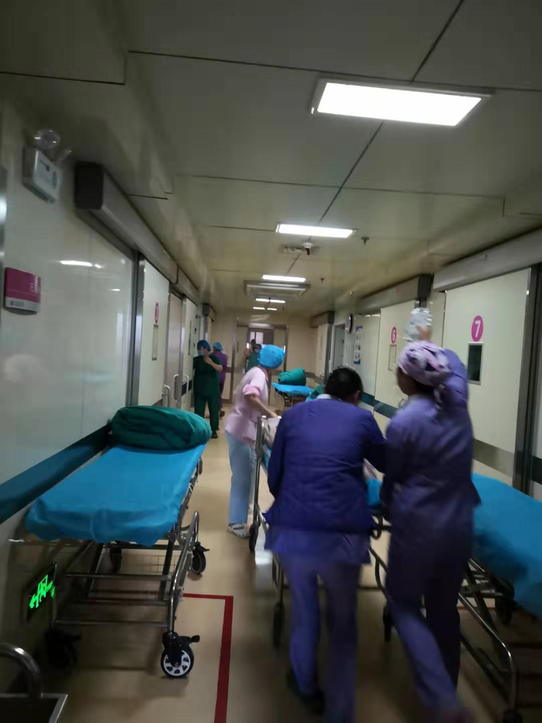 在迅速完善术前准备后,我们的助产士高举着输液瓶,一路飞奔着护送产妇进入手术室。