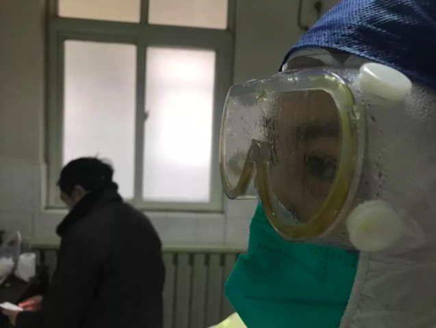 我所在隔离病区,有两个病人是在武汉上学的医学院在校大学生,一个康复专业,另一个临床医学专业。在这里,他们既是我的病人,又像是我的两个小伙伴儿。他们做完治疗的闲暇时间,用手机扑捉我们忙碌的身影。有时,我们在弯腰拖地;有时,我们在给病人配餐,有时,我们在帮病人清理个人卫生,有时,我们在给病人舒缓紧张的心情,有时,我们在紧张地给病人进行动脉穿刺;有时,我们拖着一袋垃圾留下吃力的背影;他们有一天给我拍了一张眼部大特写,护目镜里聚集的水珠竟然汇成了一湾水,他俩打趣道“这护目镜里可以毫不夸张地养条小金鱼!”