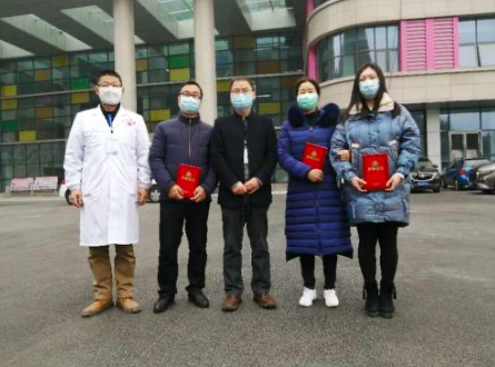 市新冠肺炎第二救治医院党委委员、副院长王作军(左三)与我院抗疫医护人员合影留念。程建军(左一)郭翠琴(右二)、邱碧莹(右一)